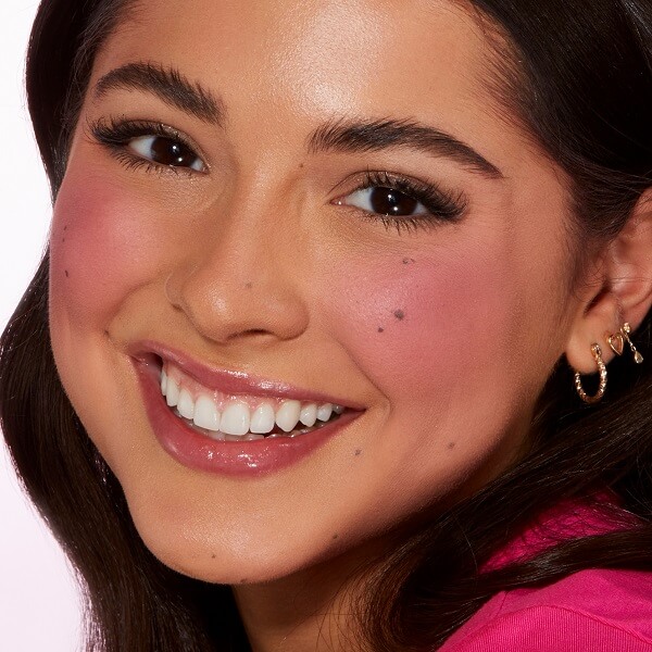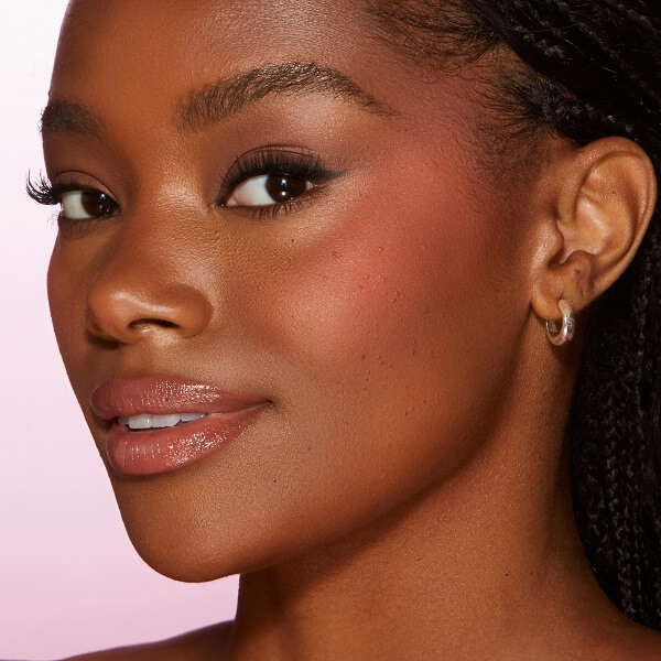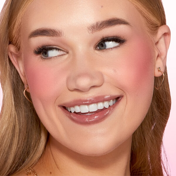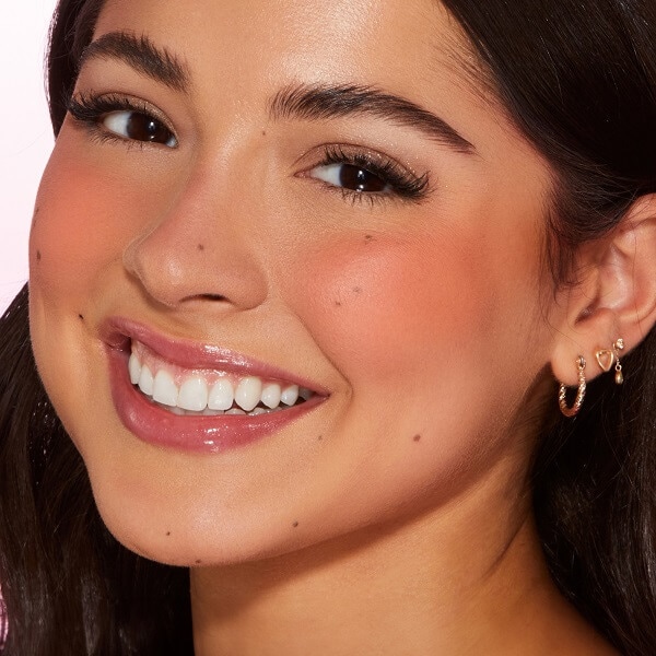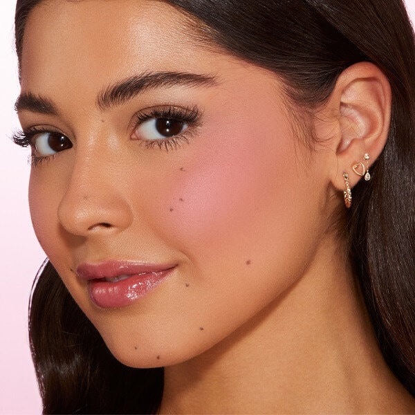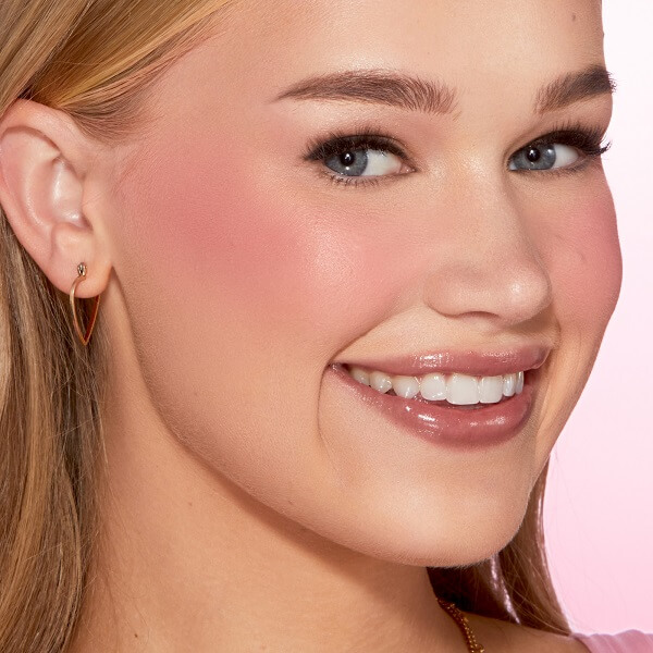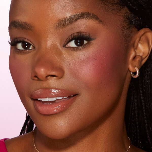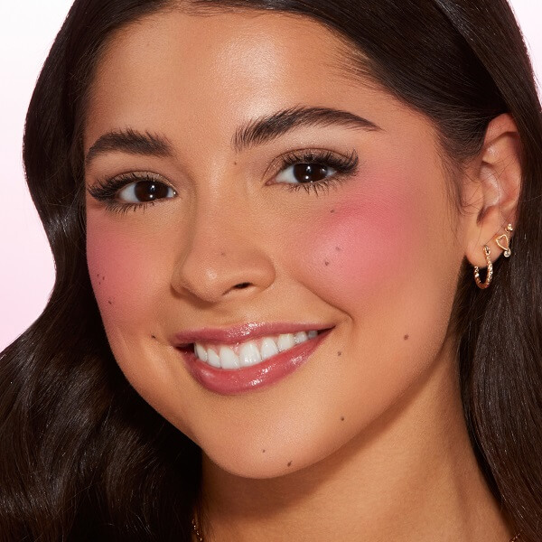 Using a blush brush, mark an “X” shape on the apple of the cheek. Then, blend out in an “O” motion. Repeat until the color payoff is achieved.